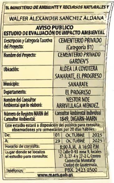 EIA-F-0155-2025 | CEMENTERIO PRIVADO GARDEN´S | ALDEA LA COYOTERA, MUNICIPIO DE SANARATE, DEPARTAMENTO DE EL PROGRESO | 2025-10-01 | 2025-10-29 |