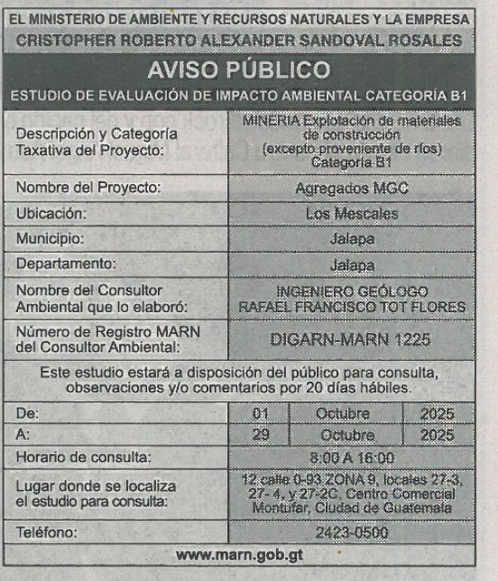 EIA-F-0156-2025 | AGREGADOS MGC | LOS MESCALES, MUNICIPIO DE JALAPA, DEPARTAMENTO DE JALAPA | 2025-10-01 | 2025-10-29 |