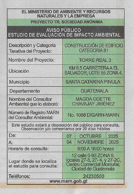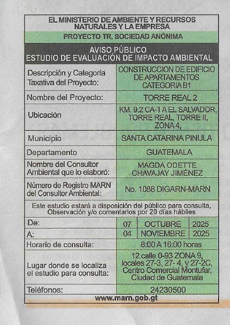 EIA-F-0159-2025 | TORRE REAL 2 | KM 9.2 CA-1 A EL SALVADOR, TORRE REAL, TORRE II, ZONA 4, MUNICIPIO DE SANTA CATARINA PINULA, DEPARTAMENTO DE GUATEMALA | 2025-10-07 | 2025-11-04 |