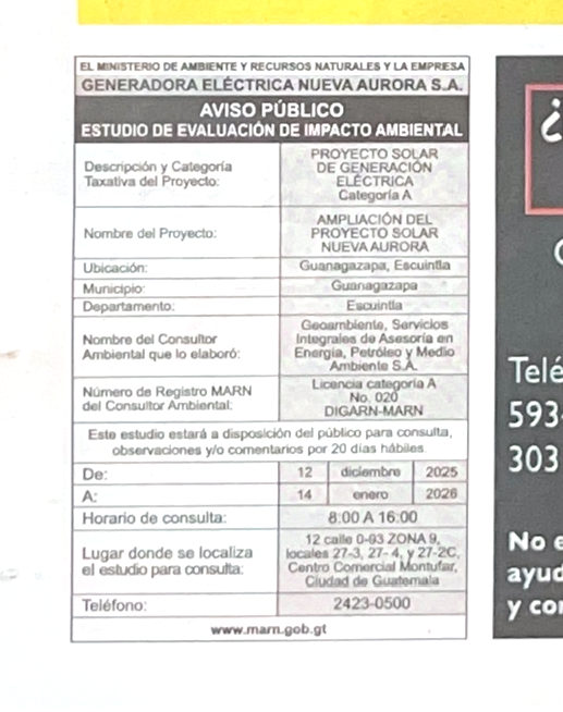 | EIA-F-0197-2025 | AMPLIACION DEL PROYECTO SOLAR NUEVA AURORA | GUANAGAZAPA, ESCUINTLA | 2025-12-12 | 2026-01-14 |