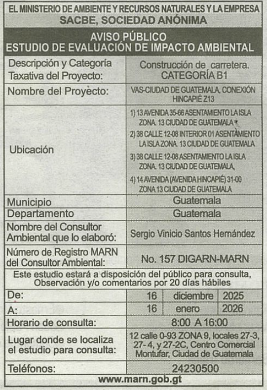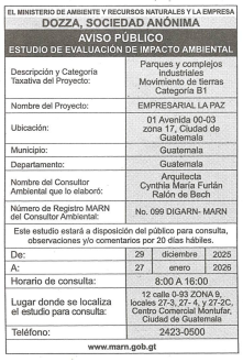 | EIA-F-0202-2025 | TERRE | 02 CALLE A 13-86 Y 13-90 COLONIA TECUN UMAN, ZONA 15, CIUDAD DE GUATEMALA, MUNICIPIO DE GUATEMALA, DEPARTAMENTOD E GUATEMALA | 2025-12-26 | 2026-01-26 |