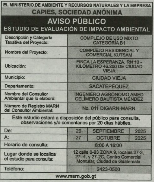 EIA-V-38-2025 | COMPLEJO RESIDENCIAL Y COMERCIAL KUTSAM | Finca La Esperanza, RN 10 - Kilómetro 46.200 | 2025-09-29 | 2025-10-27 |