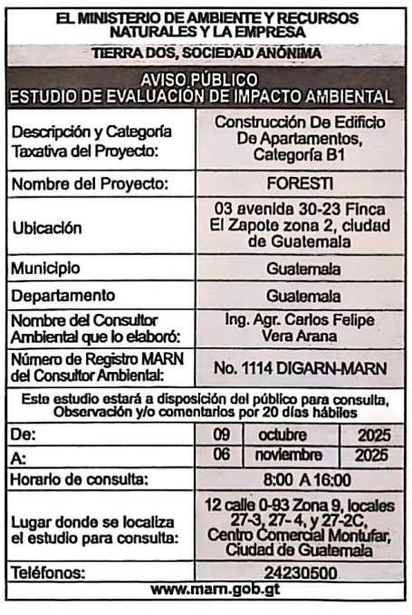EIA-V-39-2025 | FORESTI | 3ª Avenida 30-23 Finca “El Zapote” zona 02 | 2025-10-09 | 2025-11-06 |