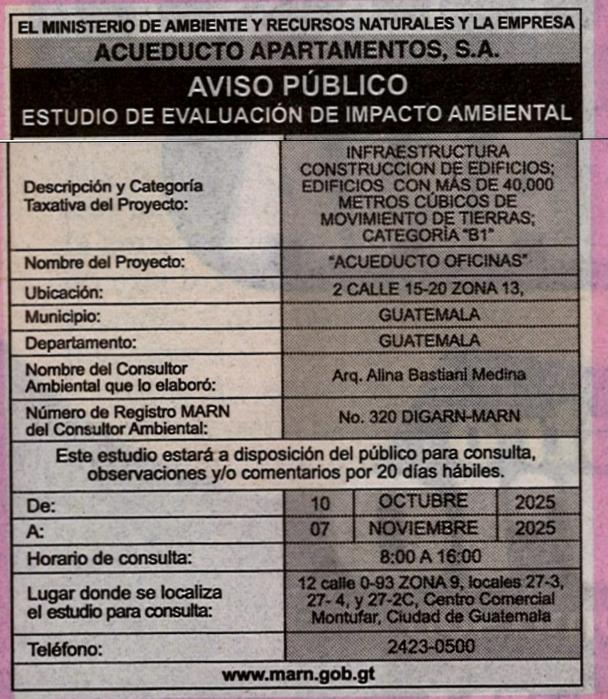 EIA-V-40-2025 | ACUEDUCTO OFICINAS | 02 CALLE 15-20 ZONA 13 | 2025-10-10 | 2025-11-07 |