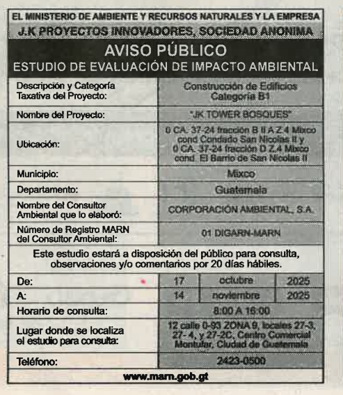 EIA-V-42-2025 | JK TOWER BOSQUES | o calle 37-24 fraccion D Z.4 mixco cond. el barrio de san nicolas II Y 0 ca.37-24 fracción B II A z.4 Mixco, Cond.Condado San Nicolas II | 2025-10-17 | 2025-11-14 |